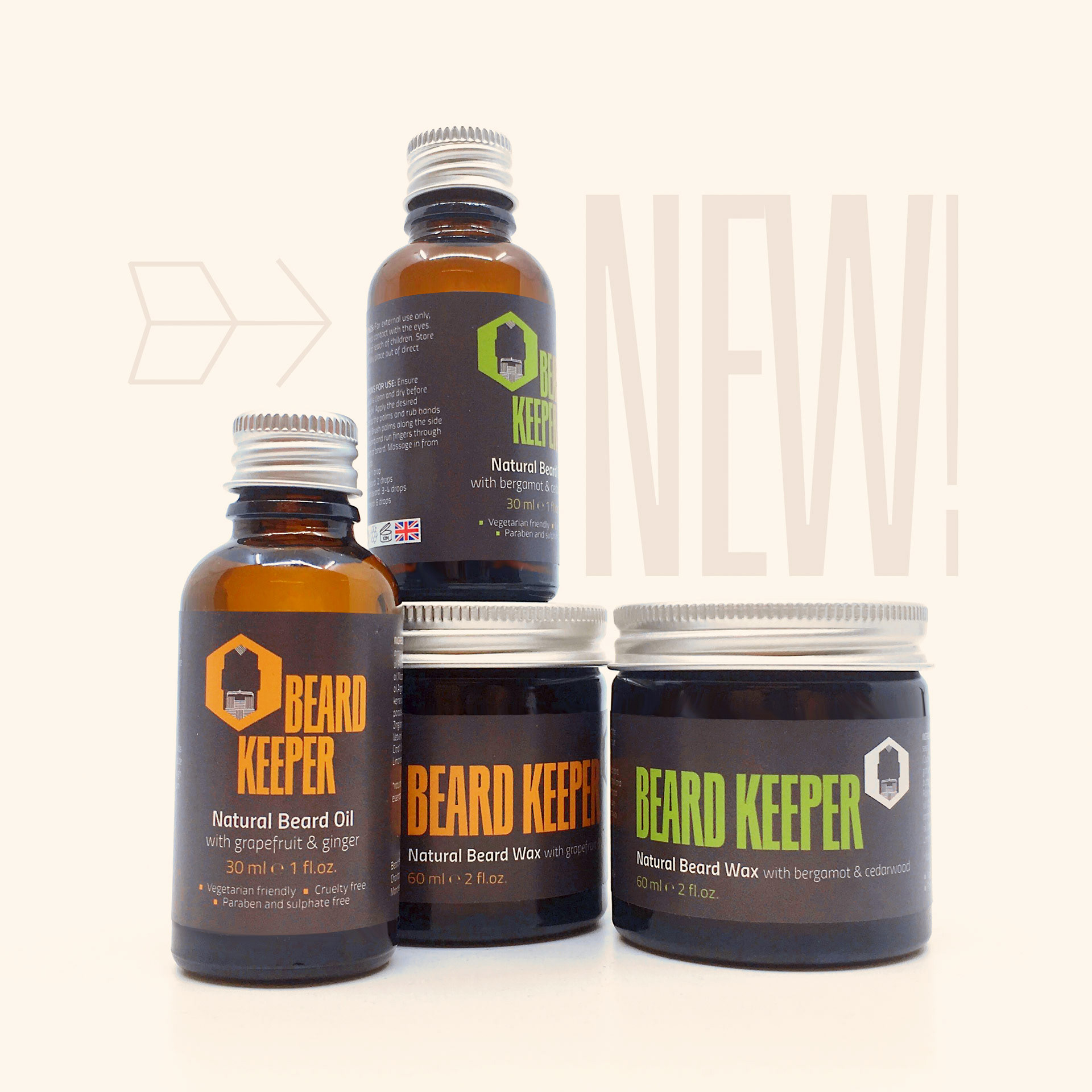 Brand identity and packaging design for Beard Keeper natural oils and waxes. "First-class bead and facial hair control comes naturally..."